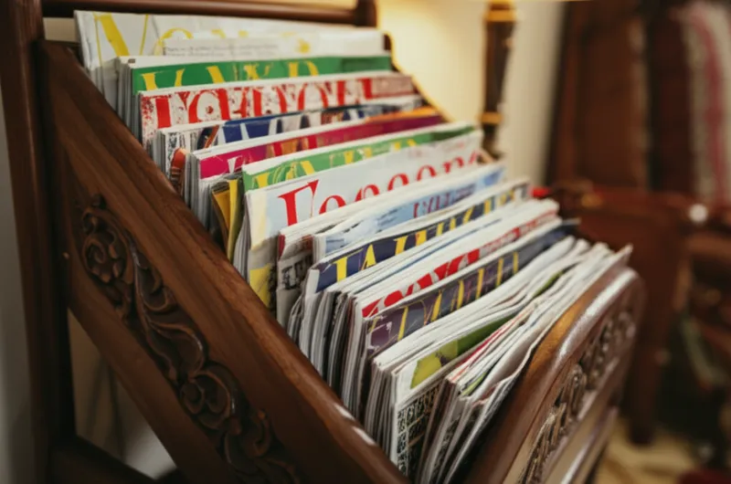 noun تحميل 🔗مشاركة حامل مجلات A rack for magazines or other papers, usually wooden, often done as a decorative piece. Examples : "We keep our magazines and newspapers neatly organized in a small wooden canterbury next to the sofa. " نحتفظ بمجلاتنا وصحفنا منظمة بشكل أنيق في حامل مجلات خشبي صغير بجوار الأريكة. style architecture item دردشة مع الذكاء الاصطناعيلعبة المفرداتتدريب القراءة