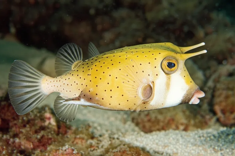 noun تحميل 🔗مشاركة سمك البقر Any of genera Acanthostracion and Lactoria, of the boxfish family Ostraciidae. Examples : "While snorkeling in the clear waters, we saw a small, yellow cowfish with tiny horns swimming near the coral reef. " أثناء الغطس في المياه الصافية، رأينا سمكة بقر صفراء صغيرة ذات قرون صغيرة تسبح بالقرب من الشعاب المرجانية. fish animal دردشة مع الذكاء الاصطناعيلعبة المفرداتتدريب القراءة