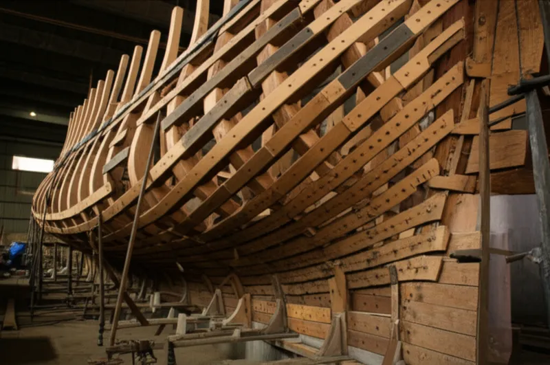 Der Schiffszimmerer verschraubte sorgfältig die Bandhölzer entlang der Rippen des Holzbootes und verstärkte soden Rahmen, bevor der Rumpf beplankt wurde.