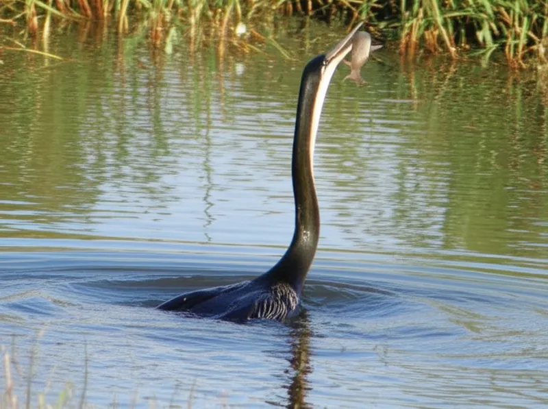 Während wir auf dem Fluss Kanu fuhren, entdeckten wir einen Schlangenhalsvogel, der auf einem Ast saß, seinen langen, schlanken Hals ausgestreckt, während erdas Wasser nach Fischen absuchte.