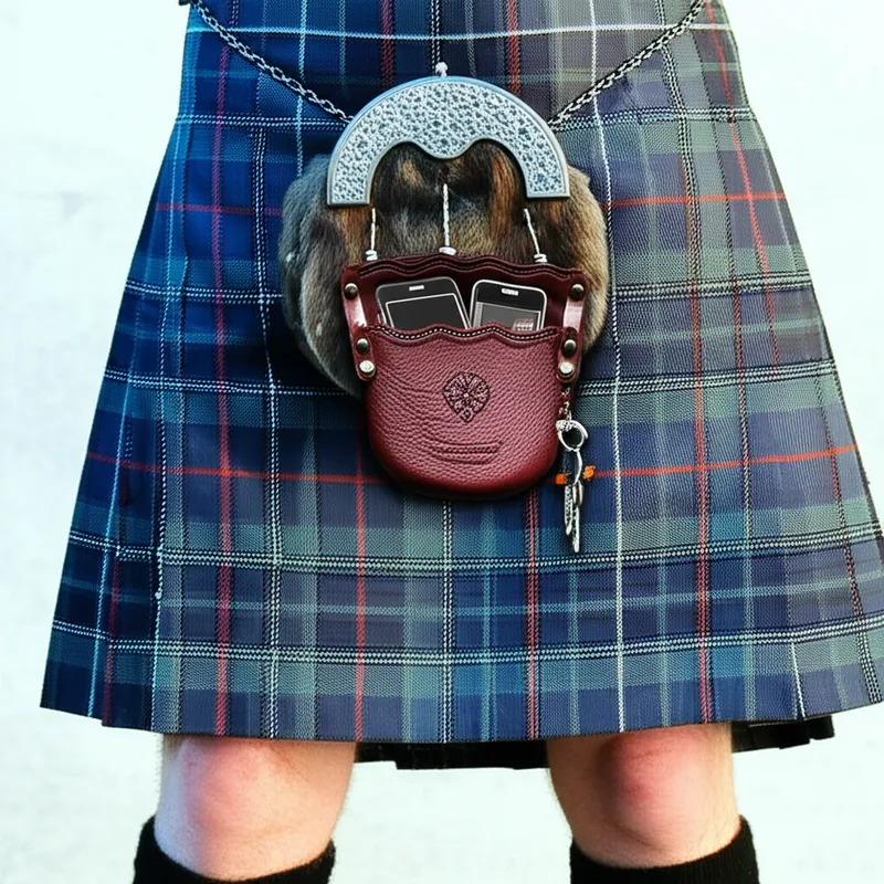 Eine kleine Tasche, meist aus Fell oder schlichtem oder fellbesetztem Leder, diean einem Gürtel oder einer Kette ander Vorderseite eines Kilts getragen wird und zur Aufbewahrung verschiedener Gegenstände dient, die normalerweise in Hosentaschen aufbewahrt werden.