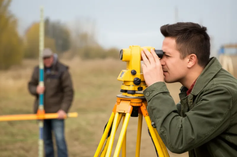 Die Vermesser verwendeten ein Stadiamessgerät, umdie Entfernung zum Gebäude auf der anderen Flussseite zu messen, indem sie den Winkel beobachteten, der durch die bekannte Höhe des Gebäudes auf dem Fadenkreuz des Stadiamessgeräts gebildet wurde.
