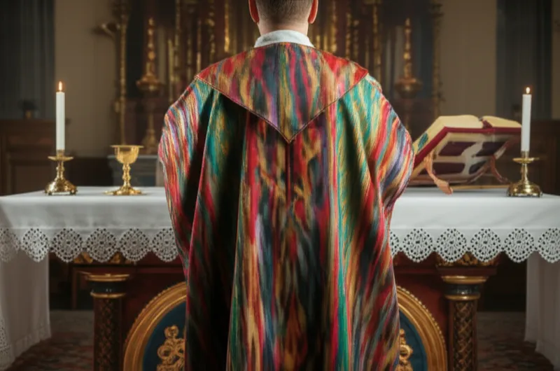 noun Télécharger 🔗Partager Chasuble The outermost liturgical vestment worn by clergy for celebrating Eucharist or Mass. Examples : "The priest wore a beautiful gold chasuble while celebrating Mass. " Le prêtre portait une belle chasuble dorée pendant la célébration de la messe. religion ritual theology wear Chat avec IAJeu de vocabulairePratiquer la lecture