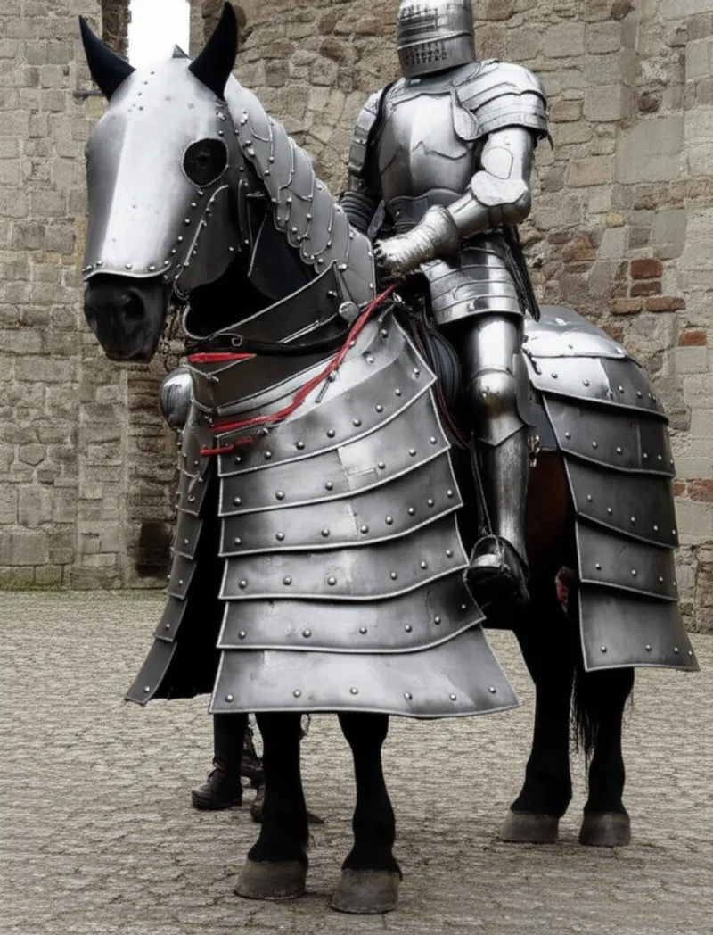 Alors queles destriers étaient autrefois de puissants chevaux de guerre, aujourd'hui, nous pourrions admirer leur tailleet leur force majestueuses lors despectacles équestres, enles imaginant comme des coursiers modernes se produisant devant la foule.