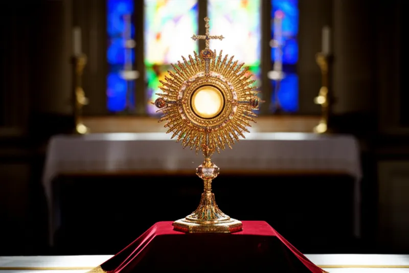 noun Télécharger 🔗Partager Ostensoir An ornamental, often precious receptacle, either open or with a transparent cover, in which the sacramental bread is placed for veneration. Examples : "During the church service, the priest carefully placed the consecrated host in the monstrance so the congregation could adore it. " Pendant la messe, le prêtre a soigneusement placé l'hostie consacrée dans l'ostensoir afin que l'assemblée puisse l'adorer. religion ritual theology architecture art Chat avec IAJeu de vocabulairePratiquer la lecture