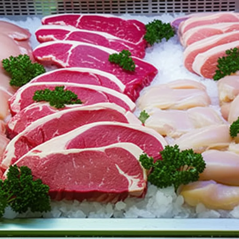 В мясной лавке витрина организовала виды мяса по их происхождению; были виды говядины с местных ферм, виды свинины из Айовы и виды баранины, импортированные из Австралии.