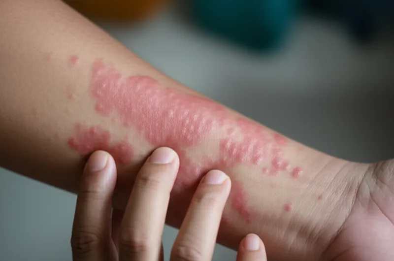 noun 下载 🔗分享 荨麻疹, 风疹块。 Itchy, swollen, red areas of the skin which can appear quickly in response to an allergen or due to other conditions. Examples : "After eating the strawberries, she broke out in hives all over her arms, so she took some allergy medicine. " 吃了草莓后,她胳膊上起了好多荨麻疹,又红又肿,还很痒,所以她吃了一些过敏药。 medicine disease body sensation appearance condition 与AI对话词汇游戏阅读练习