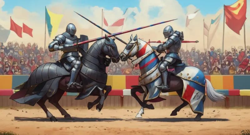 verb 下载 🔗分享 骑枪比武,马上长枪比试。 To engage in mock combat on horseback, as two knights in the lists; to tilt. Examples : "The two students, dressed in cardboard armor, jousted with wooden swords at the school festival. " 在学校的节日上,两个学生穿着纸板做的盔甲,用木剑进行了一场骑枪比武般的模拟打斗。 sport entertainment history military royal tradition event 与AI对话词汇游戏阅读练习